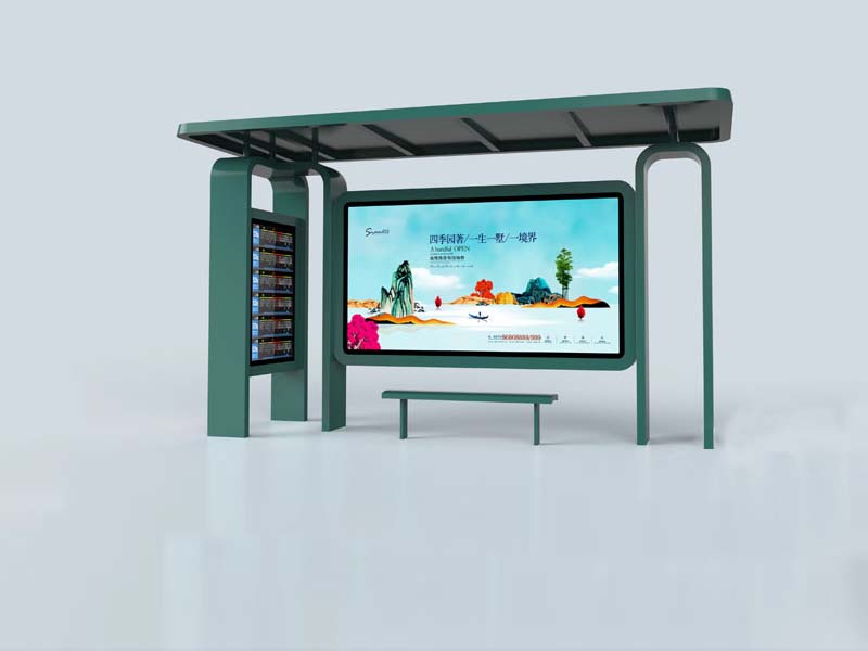 墨綠色公交候車亭,三亞的這款候車亭特別之處在立柱的造型和箱體造型,立柱為鍍鋅板折彎焊接成型,候車亭燈箱四角為圓角,常規(guī)候車亭的燈箱為直角。